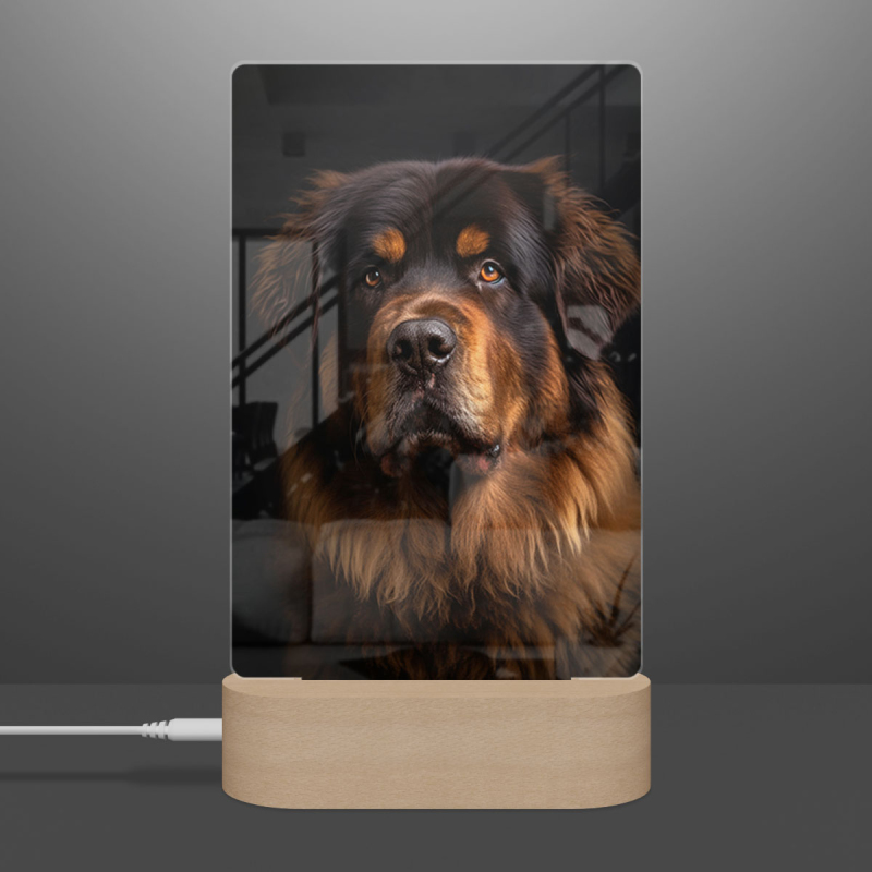 Součástí balení je akrylové sklo dle výběru, dřevěný RGB LED stojánek a napájecí USB kabel.
