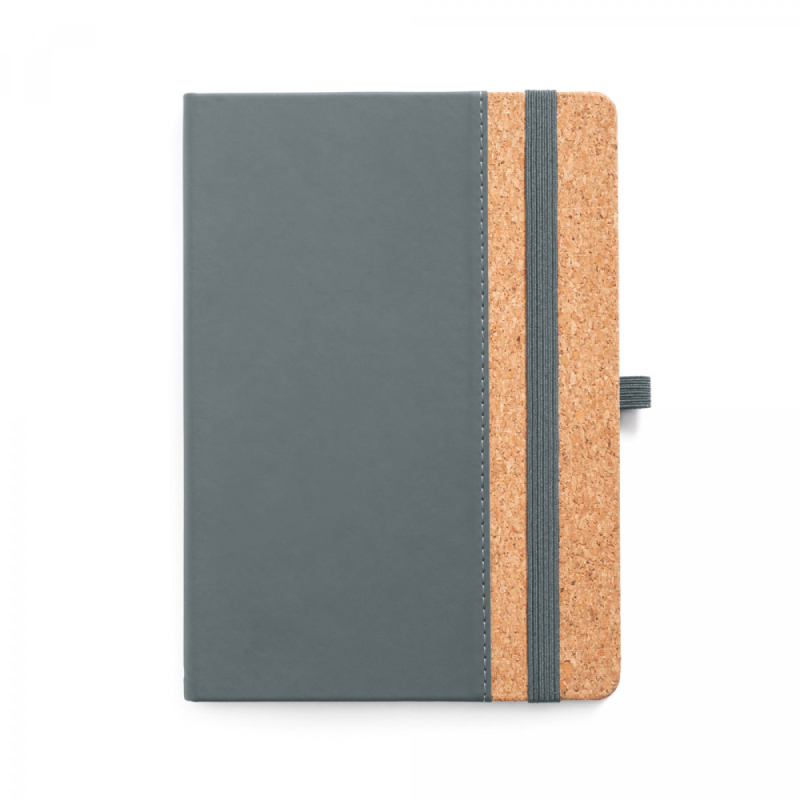 Poznámkový blok ve formátu A5 s tvrdými deskami z korku a PU, se 192 linkovanými listy v barvě slonoviny. Tento zápisník má elastickou gumičku, záložku ve formě stuhy a držák na pero (pero není součástí balení). Dodáváno v obalu z netkané textilie. 140 x 210 mm