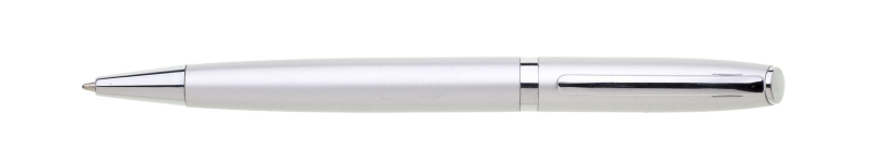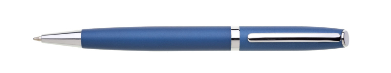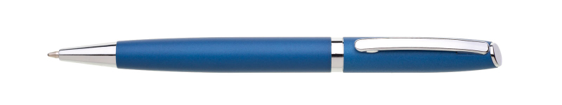 Hliníková propiska TORICO s otočným mechanismem v barvě matně modré a stříbrnými doplňky. Náplň velkoobsahová, modře píšící.