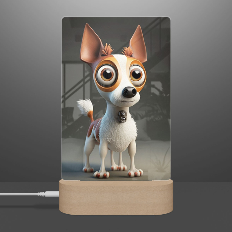Součástí balení je akrylové sklo dle výběru, dřevěný RGB LED stojánek a napájecí USB kabel.