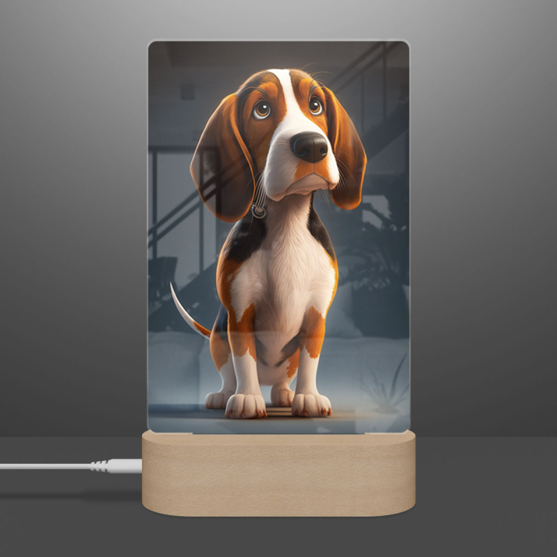 Součástí balení je akrylové sklo dle výběru, dřevěný RGB LED stojánek a napájecí USB kabel.