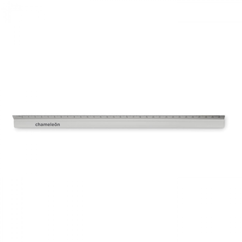 Trojúhelníkové hliníkové architektonické měřítko o délce 30 cm. Má 3 strany a 5 různých měřítek.