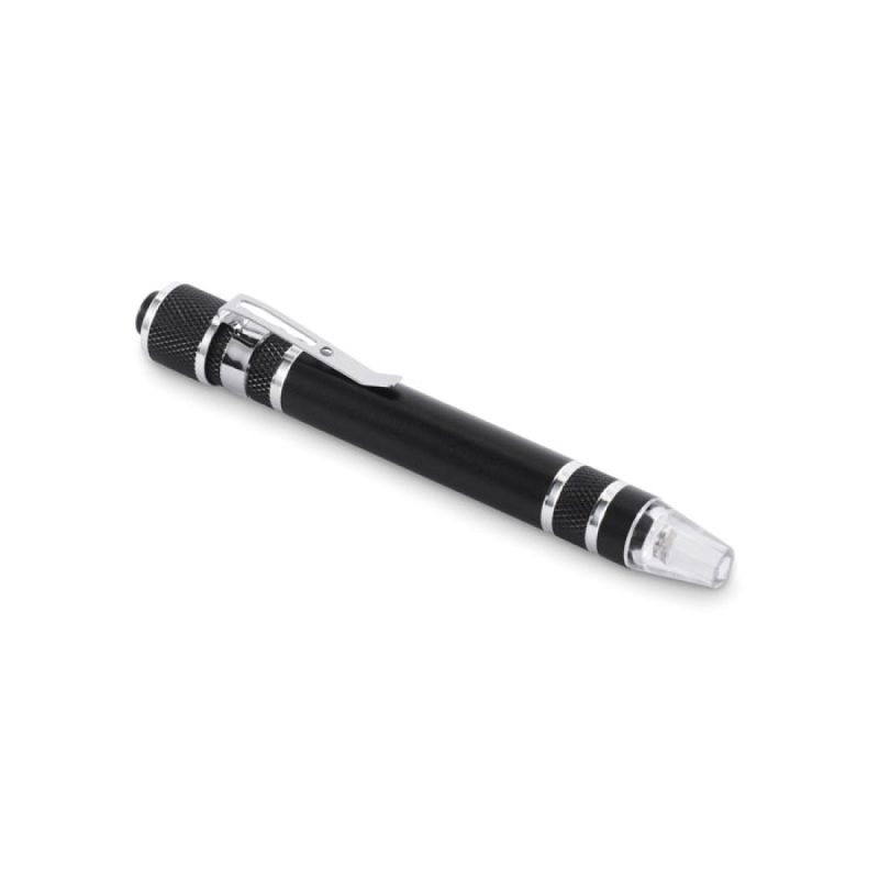 Multifunkční nástroj ve tvaru pera s baterkou, z recyklovaného hliníku. Obsahuje 3 ploché a 3 křížové šroubovací bity. 4 knoflíkové baterie LR41 jsou součástí balení.