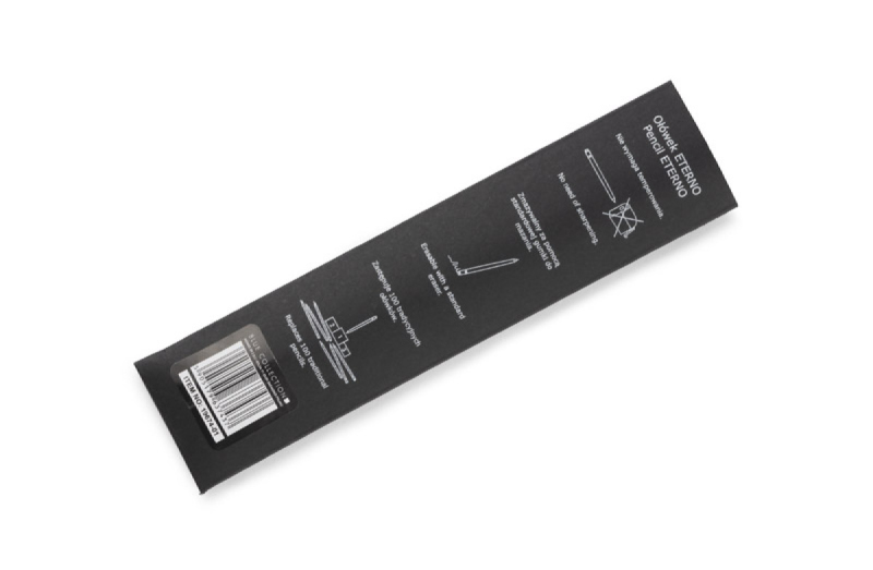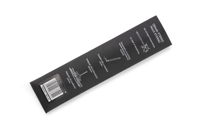 ETERNO je nový typ tužky, který bude vždy naostřený a bude psát. Tradiční grafit byl nahrazen hliníkovým stylusem, který poskytuje pohodlí při psaní podobně jako čerstvě naostřená tužka. Tělo z hliníku zajišťuje odolnost po celá léta. V horní části je mazací guma, která vymaže poznámky vytvořené tužkou ETERNO (můžete také použít jiné standardní gumy). Tužka je součástí ekologického trendu, který umožňuje minimalizovat množství odpadu a surovin použitých při výrobě předmětů každodenní potřeby. Baleno v černém papírovém pouzdře s infografikou na zadní straně.