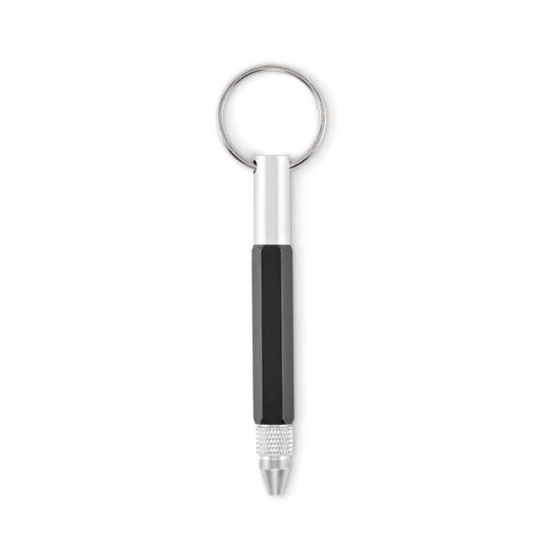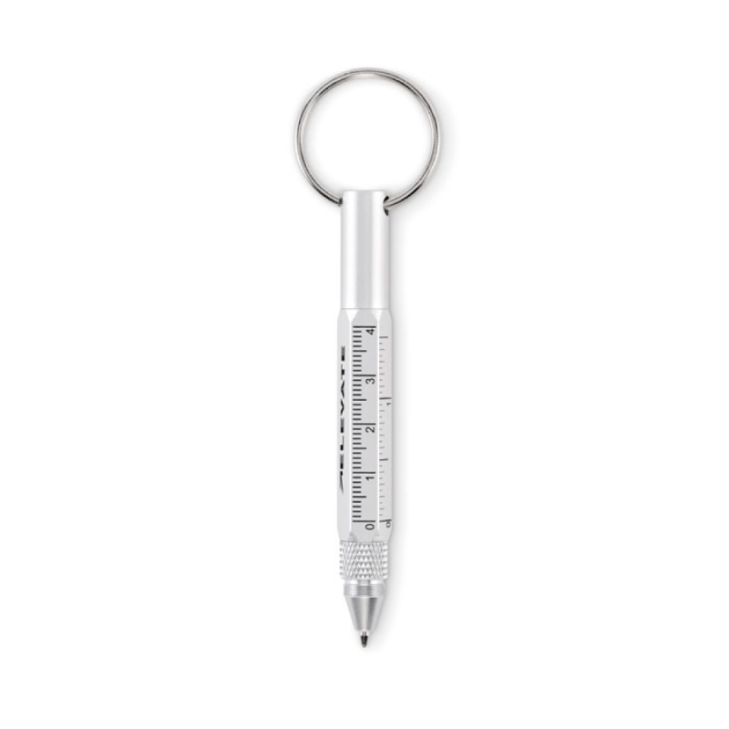Přívěsek na klíče, propiska, pravítko 4 cm a 1,5 palce, stylus, křížový a plochý šroubovací bit 2v1. Černý inkoust. Vyrobeno z recyklovaného hliníku.