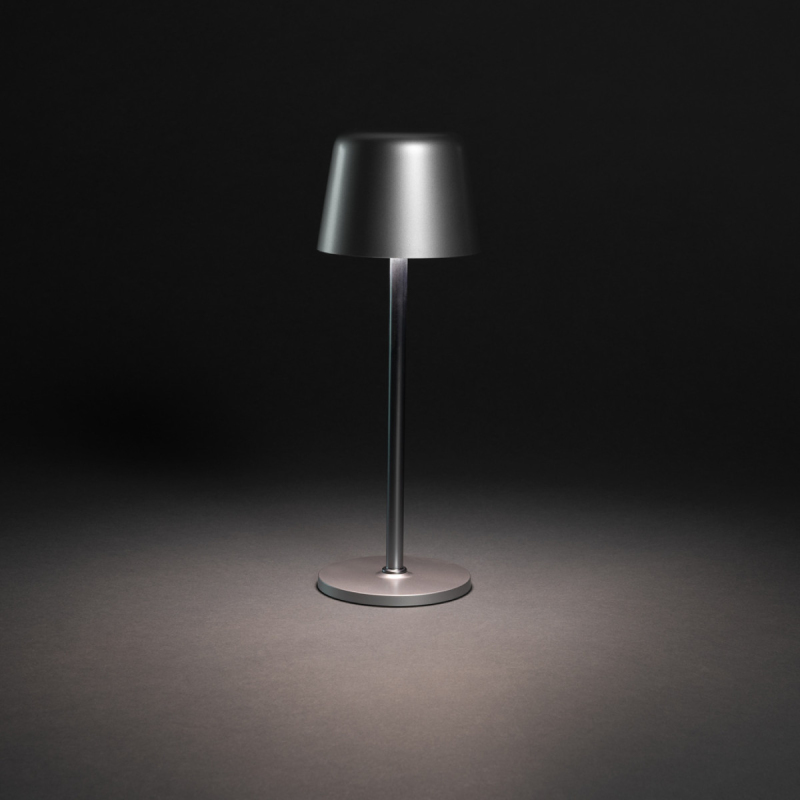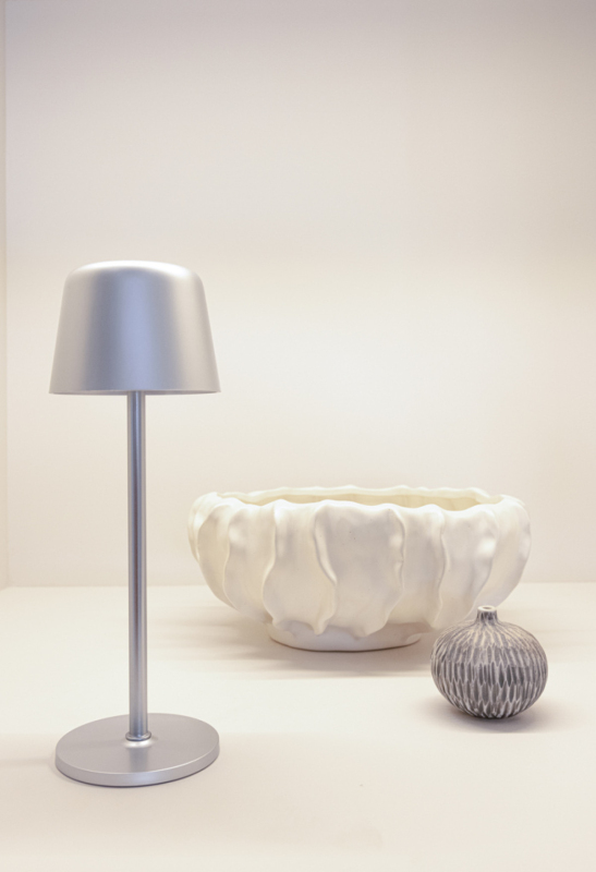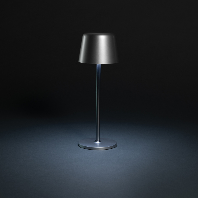Dobíjecí a přenosná stolní lampa. Vyrobeno z RCS certifikovaného recyklovaného ABS a kovové tyče. RCS certifikace zajišťuje garanci použití recyklovaného materiálu díky transparentnímu přehledu nad dodavatelským řetězcem. Celkový podíl recyklátu dle váhy produktu: 51 %. Stolní lampa funguje na jedno nabití až 8 hodin a lze ji znovu nabít během 3 hodin. Lampa disponuje 3 světelnými režimy (teplé světlo, bílé světlo a neutrální), který lze upravit dotykem na horní část lampy. Dobíjení přes USB-C, součástí je 80 cm nabíjecí kabel z recyklovaného TPE. Baleno v papírovém obalu.