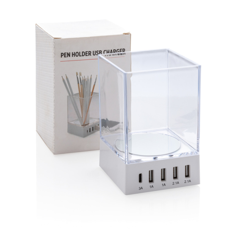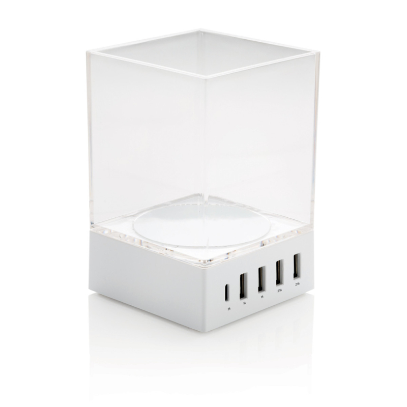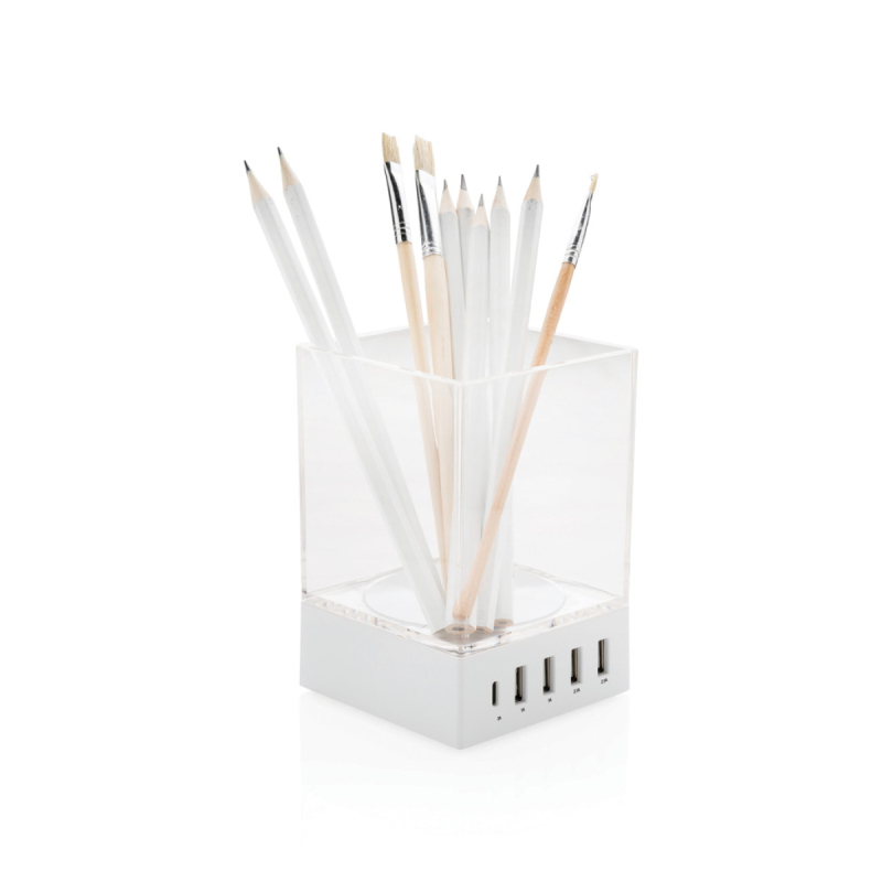 Udržujte si díky této moderní stolní nabíječce svůj pracovní stůl čistý a svá zařízení nabitá. porty USB a jedním portem typu C 2.0 pro nabíjení nejnovější generace mobilních zařízení. S modrým světelným indikátorem značícím nabíjení zařízení. Stojánek na tužky je vyroben z PC a nabíječka z ohnivzdorného ABS. S 1,5 metr dlouhým nabíjecím EU kabelem.