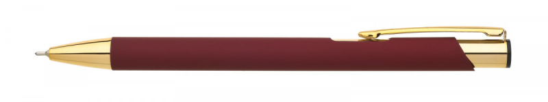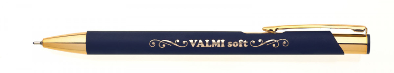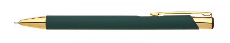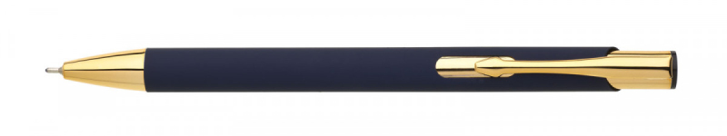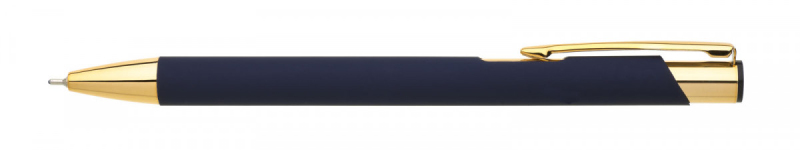 Kovová propiska s pogumovaným povrchem a zlatými doplňky, s efektem laseru v lesklé zlaté barvě. Náplň semigelová s mikrohrotem.