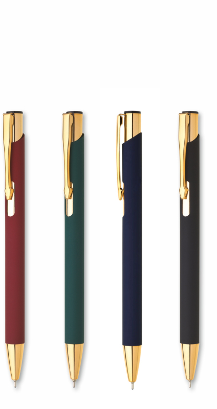 Kovová propiska s pogumovaným povrchem a zlatými doplňky, s efektem laseru v lesklé zlaté barvě. Náplň semigelová s mikrohrotem.