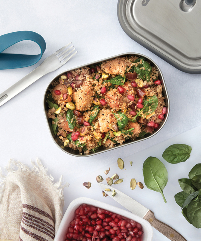 Plně nepropustná krabička na jídlo z nerezové oceli. Multifunkční provedení 3 v 1, které umožní přepravovat oběd, vařit pokrmy v troubě a dokonce ukládat uvařená jídla v mrazáku. Vyrobený z odolné nerezové oceli je ideální pro stylové nošení vašich kulinářských výtvorů. Silikonový ventil vytváří bezpečný vakuově utěsněný uzávěr, posuvná přepážka umožňuje snadné oddělení obsahu a pro pohodlí jsou přidány vidlička a držák. Krabička i vidlička jsou vhodné do myčky. Víko a poutko pouze pro ruční mytí.