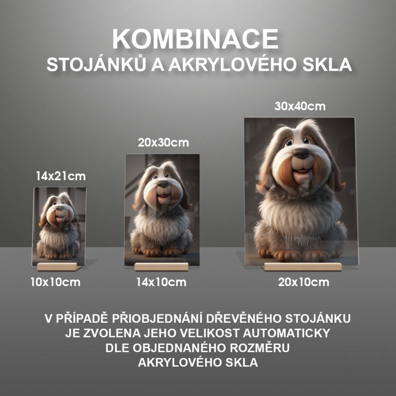 Na produktovém fotu vyobrazena nejoblíbenější varianta akrylového skla 14x21cm a dřevěný stojánek 10x10cm.