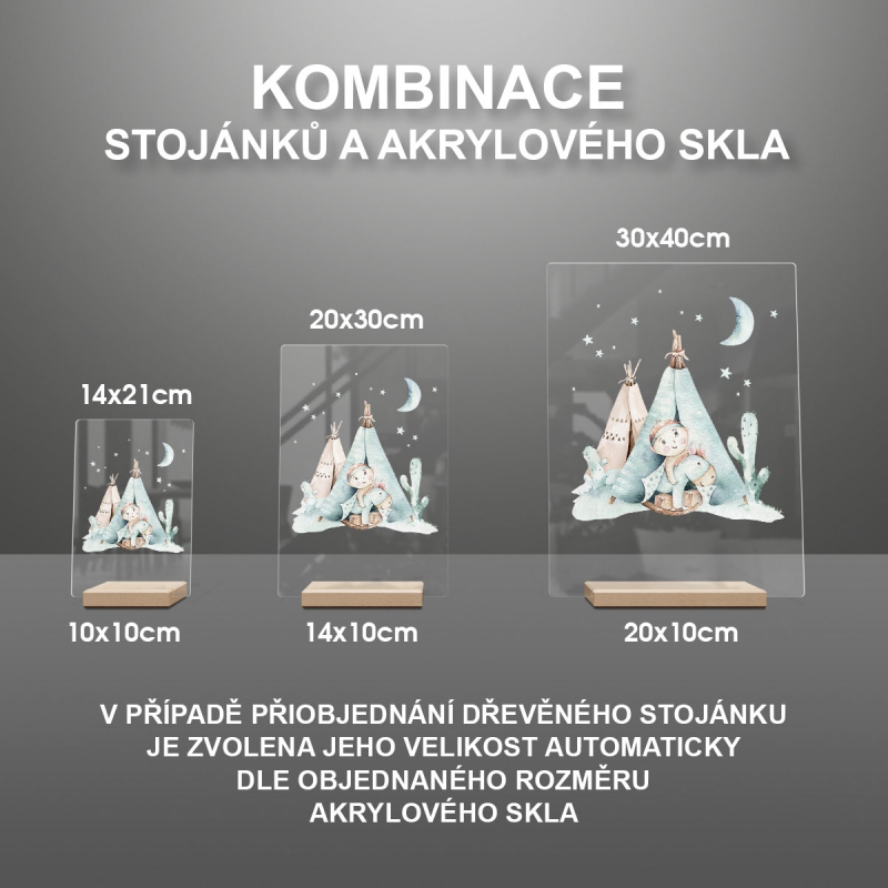 Na produktovém fotu vyobrazena nejoblíbenější varianta akrylového skla 14x21/21x14cm a dřevěný stojánek 10x10cm.