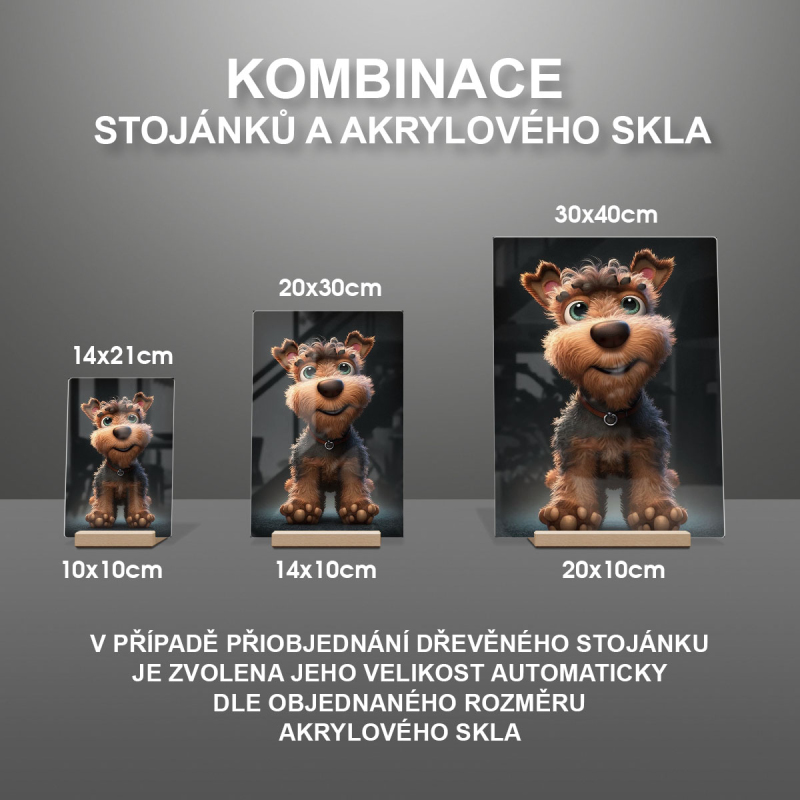 Na produktovém fotu vyobrazena nejoblíbenější varianta akrylového skla 14x21cm a dřevěný stojánek 10x10cm.