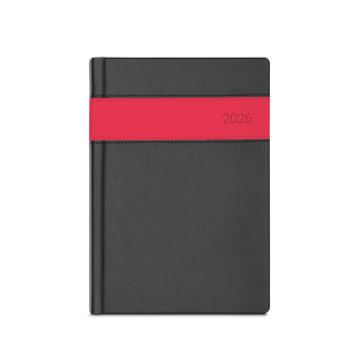 B5 diář z polyuretanu (PU). Magnetické uzavření s lesklým kovovým prvkem a stuhou na označení stránky. Organizován do týdenního plánu. S držákem na kuličkové pero (součást balení). Dodává se s netkaným obalem. 175 x 245 mm | Obal: 220 x 270 mm