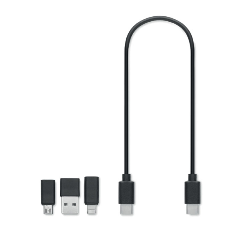 Nabíjecí kabel 3 v 1 s různými konektory. Dodáváno v krabičce z akáciového dřeva. Kabel Type-C na Type C, C na USB-A, C na micro-B, C connectors.