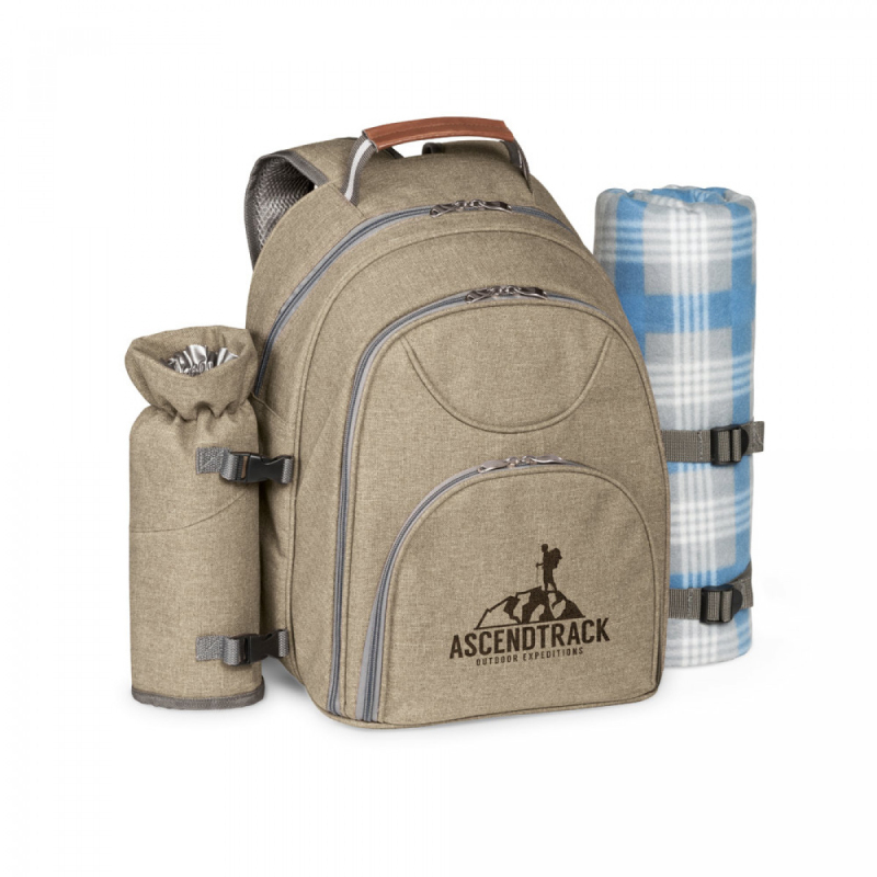 Piknikový batoh z 600D s vysokou hustotou. Batoh má odnímatelnou přikrývku a termosku. Hlavní komora je polstrovaná a má izolační vrstvu. Přední kapsa je vybavená podšívkou z 210D a je polstrovaná. Přední kapsa má odnímatelný držák na nádobí, jehož součástí je 12 příborů z nerezové oceli (4 vidličky, 4 nože a 4 lžíce), 4 talíře, 4 kelímky PS, 4 bavlněné ubrousky, 1 solnička, 1 pepřenka, 1 deska PP a 1 vývrtka. Oddíl na láhev a hlavní přihrádka jsou plně podšité (PEVA) a polstrované. Přikrývka z polární tkaniny 160 g/m², s podšívkou z PEVA. 300 x 410 x 120 mm | Obal na láhev: ø105 x 300 mm | Deka: 1500 x 1350 mm