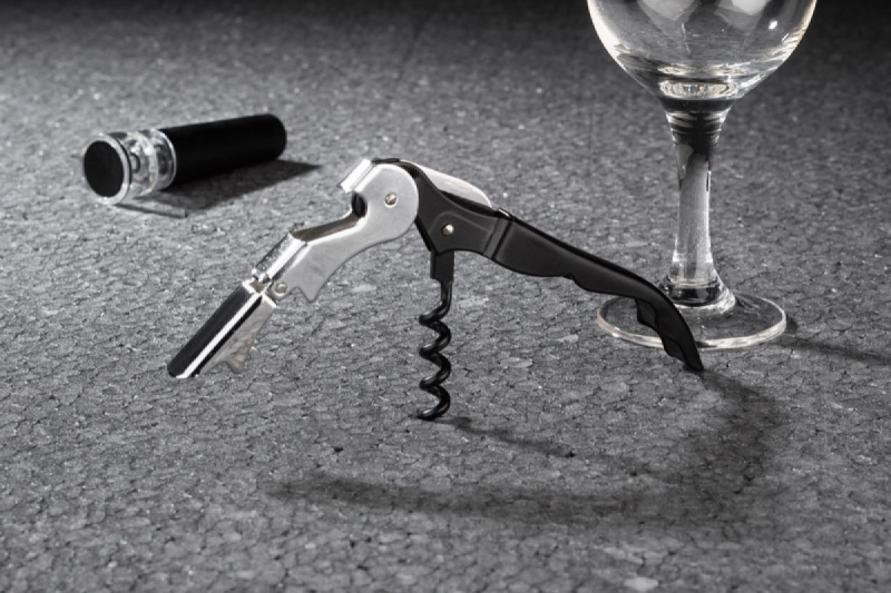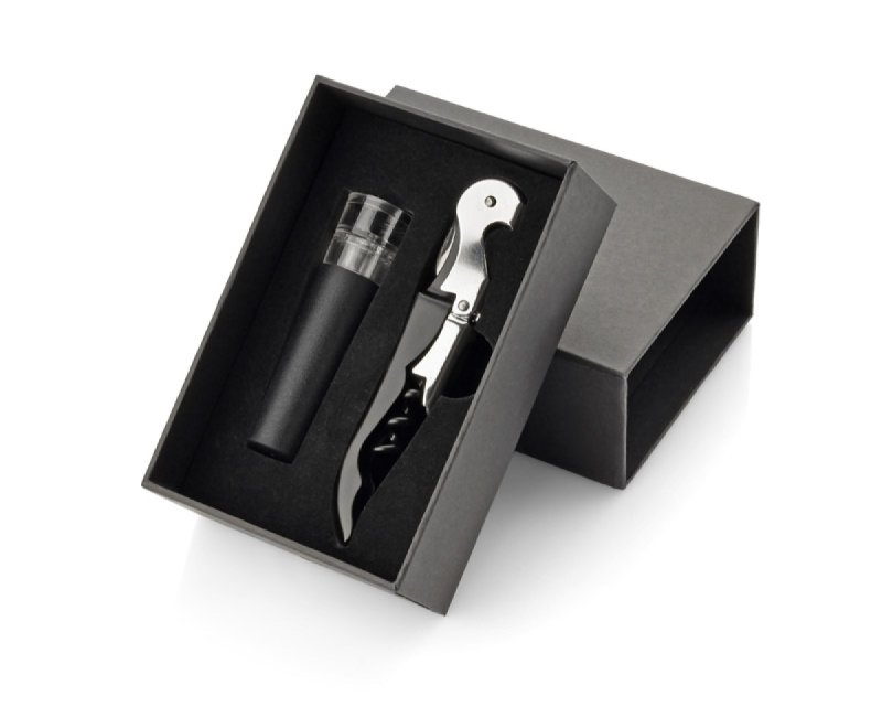 Elegantní dvojčlenná sada na víno obsahuje víčko s vysávačem a korkový otvírák. Víčko s vysávačem umožňuje udržet všechny aroma ve sklenici, navíc můžete víno udržet otevřené po delší dobu. Tato sada je balena v elegantní černé krabičce.