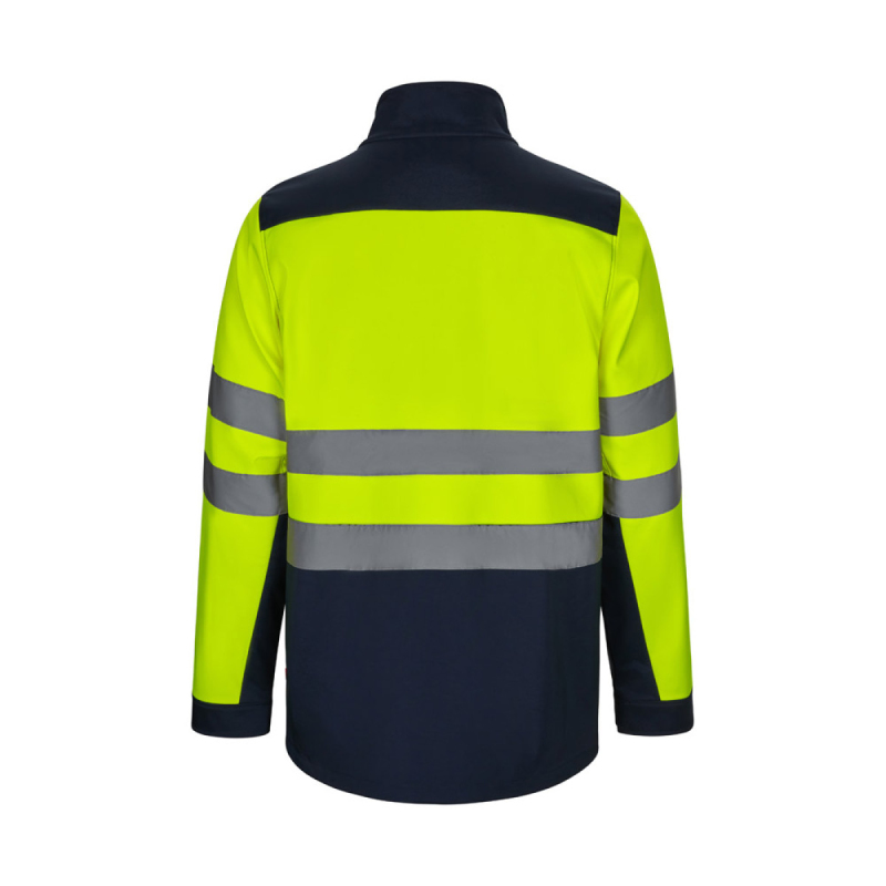 "Dvoubarevná softshellová bunda (280 g/m²), z polyesteru (96%) a elastanu (4%). TPU potažená a s fleecovou podšívkou. Centrální obrácený zip v kontrastní barvě, nastavitelné manžety se suchým zipem. Reflexní pruhy na trupu a rukávech Obsahuje pět kapes: 3 kapsy na zip a 2 vnitřní kapsy." Velikost: S, M, L, XL, 2XL, 3XL