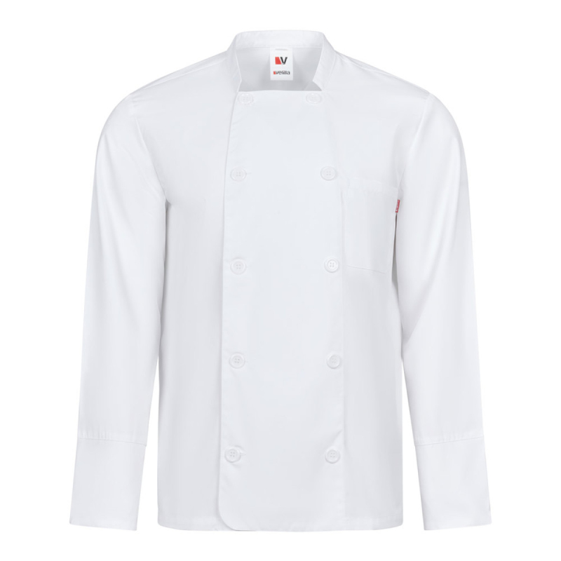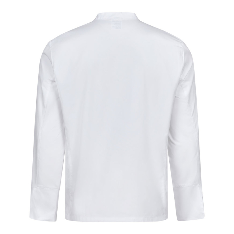 Kuchyňská bunda s dlouhým rukávem (175 g/m²) z bavlny (35 %) a polyesteru (65 %). Se zapínáním na dva knoflíky, zapínáním na manžetách a 1 náprsní kapsou. Velikost: 44, 46, 48, 50, 52, 54, 56, 58, 60, 62, 64
