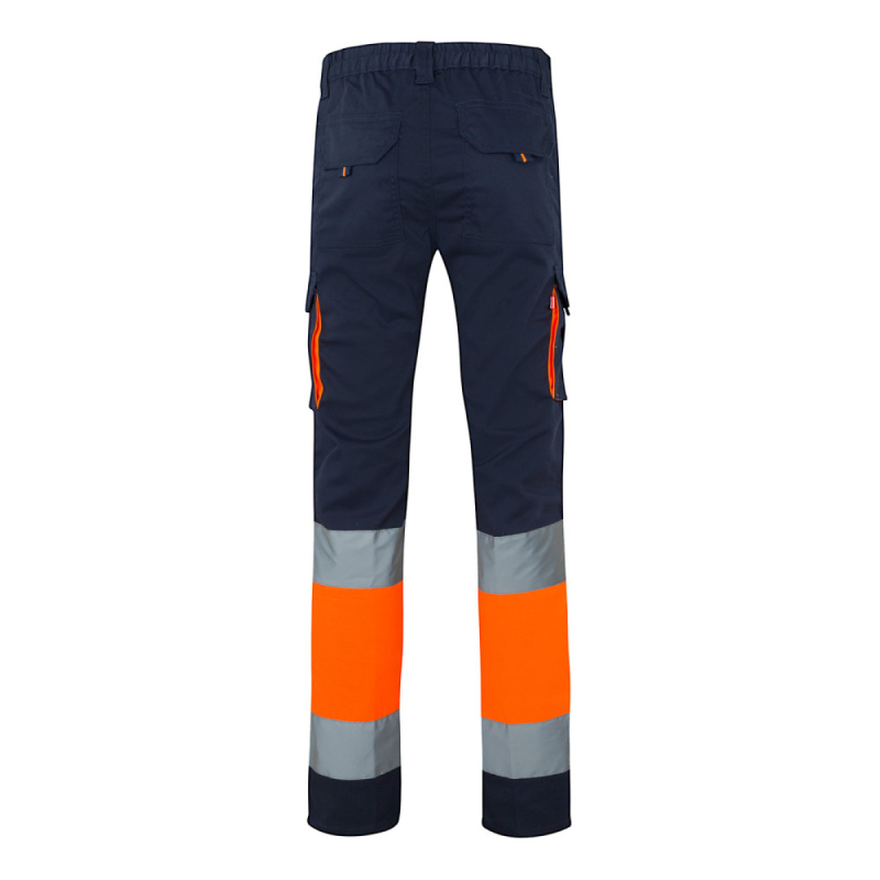 Dvoubarevné strečové kalhoty s mnoha kapsami (240 g/m²), z bavlny (46 %), EME (38 %) a polyesteru (16 %). S elastickým pasem a reflexními pruhy na spodní části nohavic. Kontrastní barva na měchu, stahovačkách a látce mezi reflexními pruhy Šest kapes (2 francouzské kapsy, 2 boční kapsy na měch a 2 zadní kapsy)" Velikost: S, M, L, XL, 2XL, 3XL
