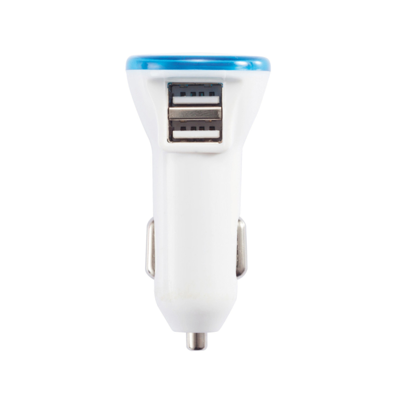 Přenosná USB nabíječka do auta s duálním USB konektorem a integrovaným LED osvětlením v přední části. Výstup: 5 V/2,1 A