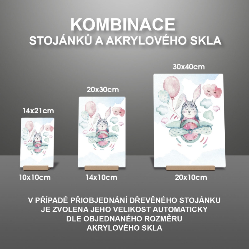 Na produktovém fotu vyobrazena nejoblíbenější varianta akrylového skla 14x21/21x14cm a dřevěný stojánek 10x10cm.