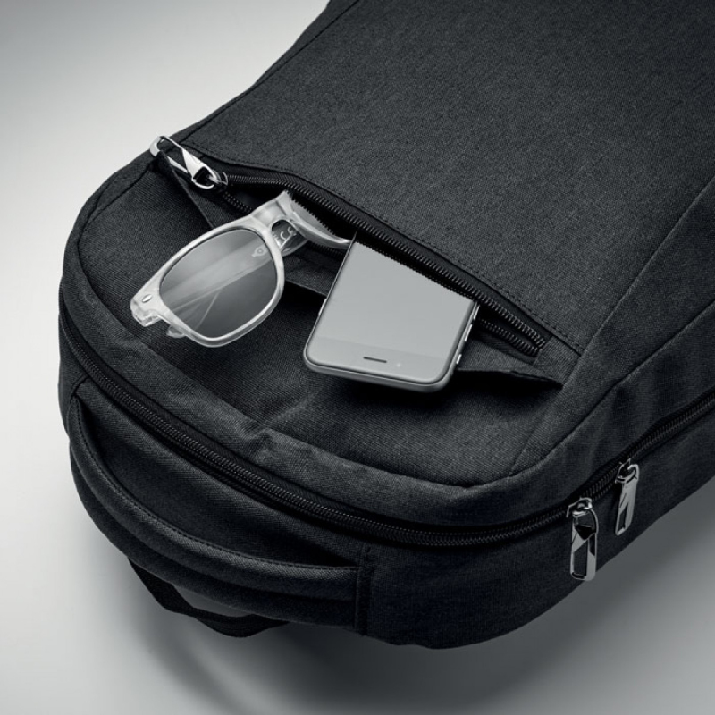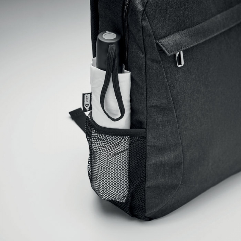 Batoh na 15 palcový notebook z polyesteru 600D RPET. Vnitřní kapsa na notebook a několik malých vnitřních přihrádek. Má přední kapsu na zip a 2 boční síťované kapsy. Nastavitelné ramenní popruhy. Držák na kufr na kolečkách na zadní straně.