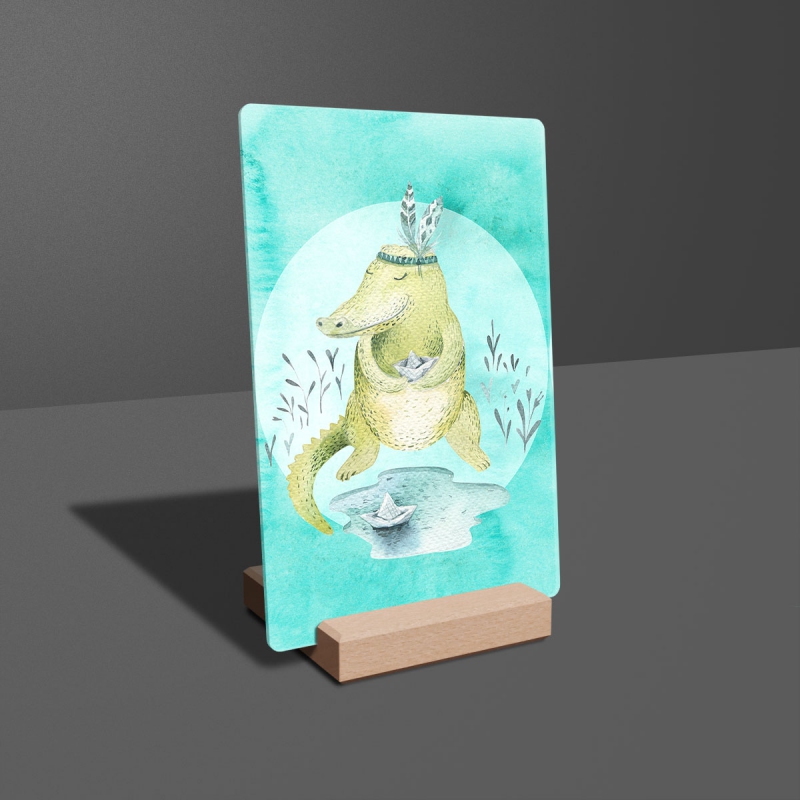 Na produktovém fotu vyobrazena nejoblíbenější varianta akrylového skla 14x21/21x14cm a dřevěný stojánek 10x10cm.