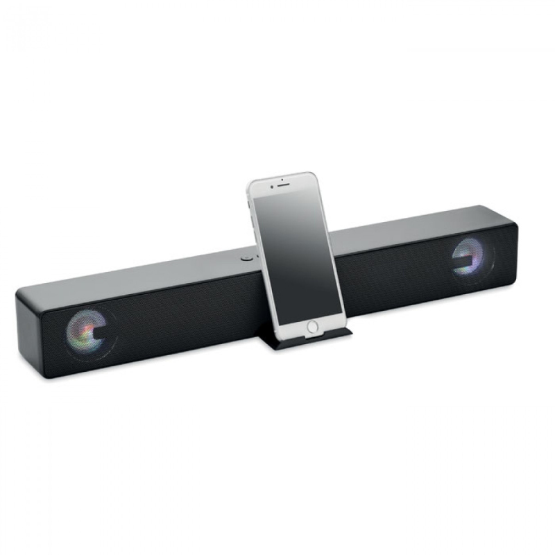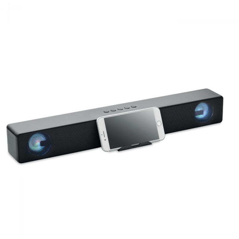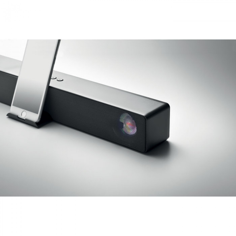 Bezdrátový reproduktor 5.0 Soundbar z ABS plastu s měnícím se náladovým světlem a stojánkem na telefon. Součástí balení je dobíjecí baterie Li-ION s kapacitou 2000 mAh. Výstupní údaje: 5W. Doba přehrávání cca 4 h.