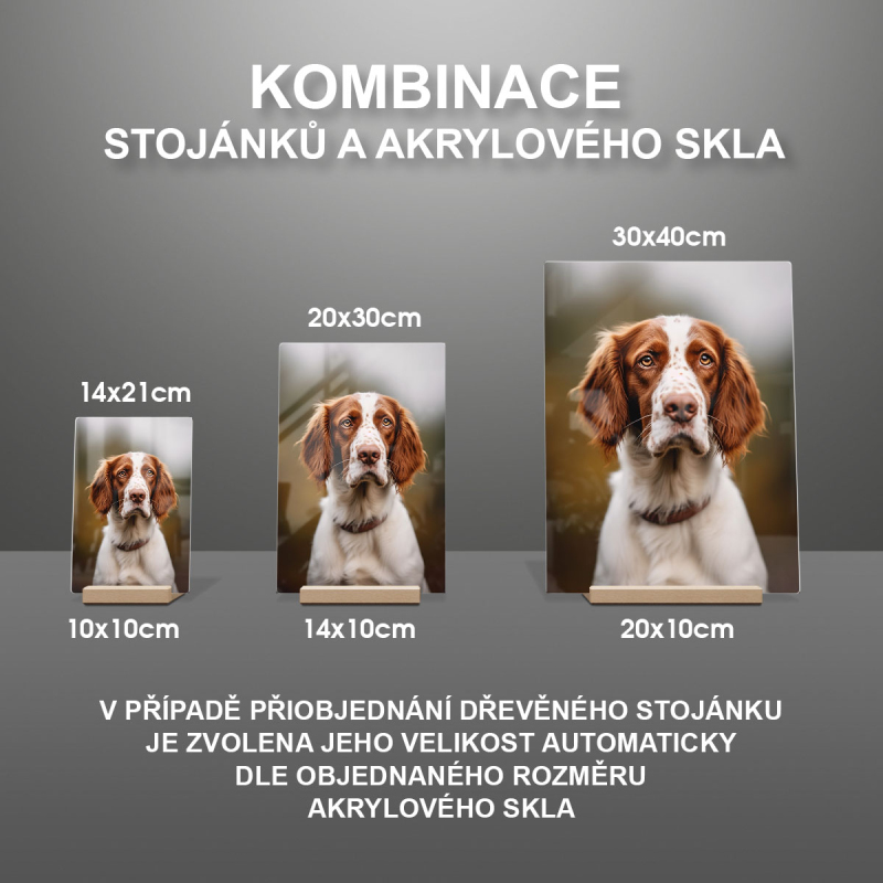 Na produktovém fotu vyobrazena nejoblíbenější varianta akrylového skla 14x21cm a dřevěný stojánek 10x10cm.