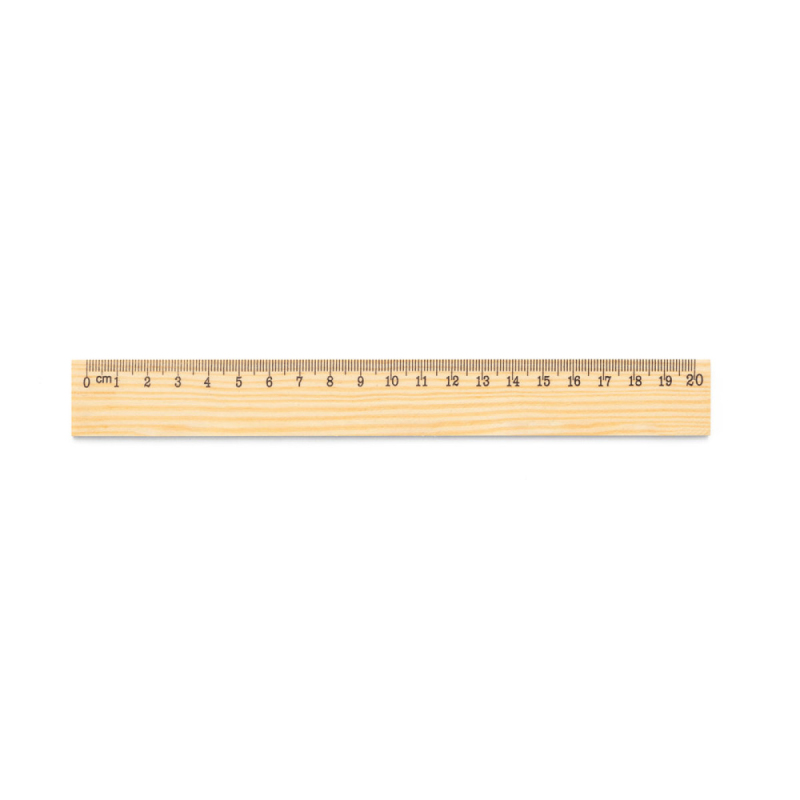 Pravítko z borovicového dřeva s 20cm stupnicí potištěnou černou barvou. Protože je výrobek vyroben z přírodních materiálů, barva a velikost výrobku a výsledek tisku se mohou u jednotlivých výrobků lišit. 209 x 25 mm