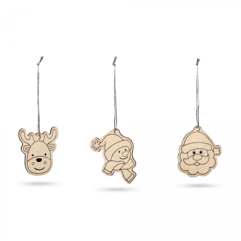 Sada pro malbu na dřevo. Součástí jsou 3 vánoční dekorace s obrázky na kreslení, se stuhami na zavěšení a 4 barevnými tužkami. 122 x 94 x 14 mm