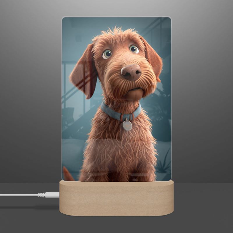 Součástí balení je akrylové sklo dle výběru, dřevěný RGB LED stojánek a napájecí USB kabel.