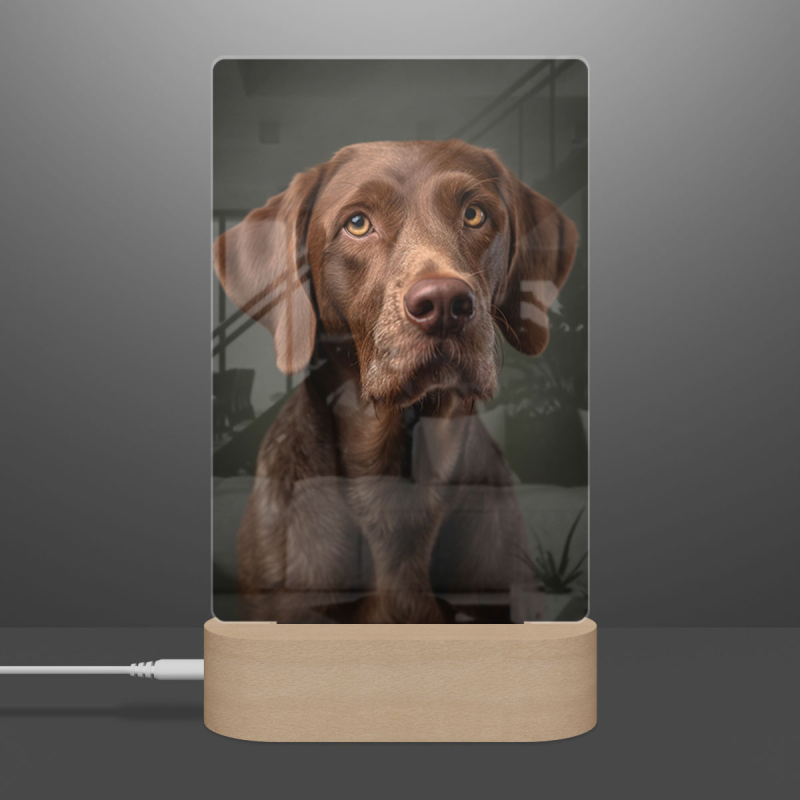 Součástí balení je akrylové sklo dle výběru, dřevěný RGB LED stojánek a napájecí USB kabel.