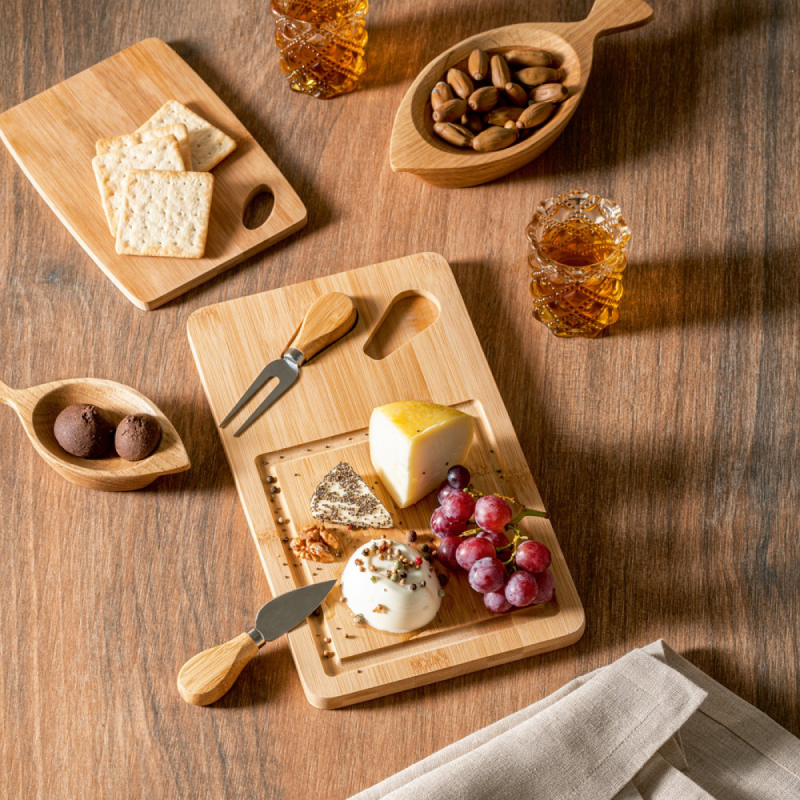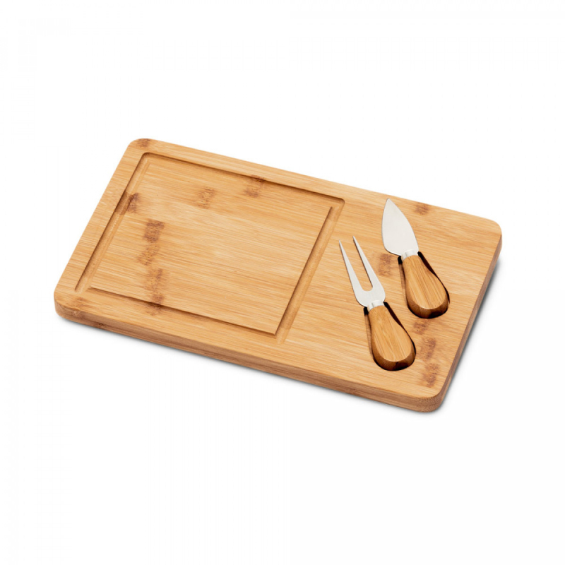 Bambusové prkénko na sýr se 2 nástroji z bambusu a nerezové oceli. Toto potisknutelné prkénko se dodává v kartonové krabici. 310 x 180 x 15 mm | Krabička: 316 x 186 x 25 mm