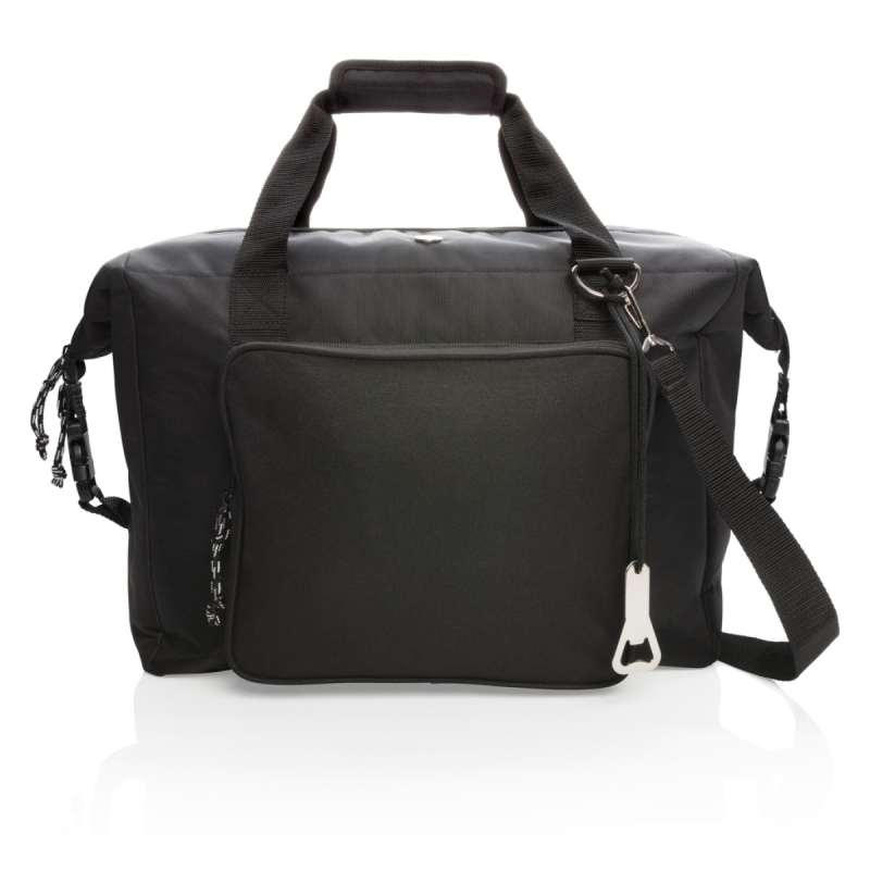 Luxusní polyesterová 1680D a 600D chladicí nákupní taška s extra velkým hlavním oddílem na zip a přední kapsou na zip. Tuto tašku lze zapnutím bočních popruhů jednoduše proměnit na chladicí sportovní tašku. Obrovský prostor 40 l. Pojme až 10 lahví o objemu 1,5 l nebo 52 plechovek. Dvě zesílená ucha. Odnímatelný nastavitelný ramenní popruh. Včetně otvíráku lahví. Izolace PEVA.