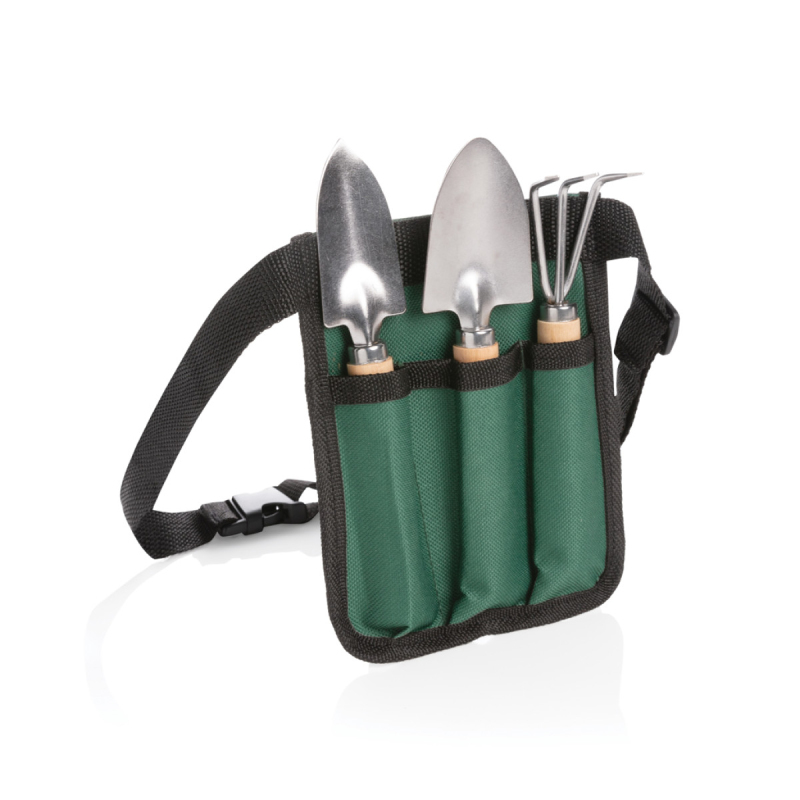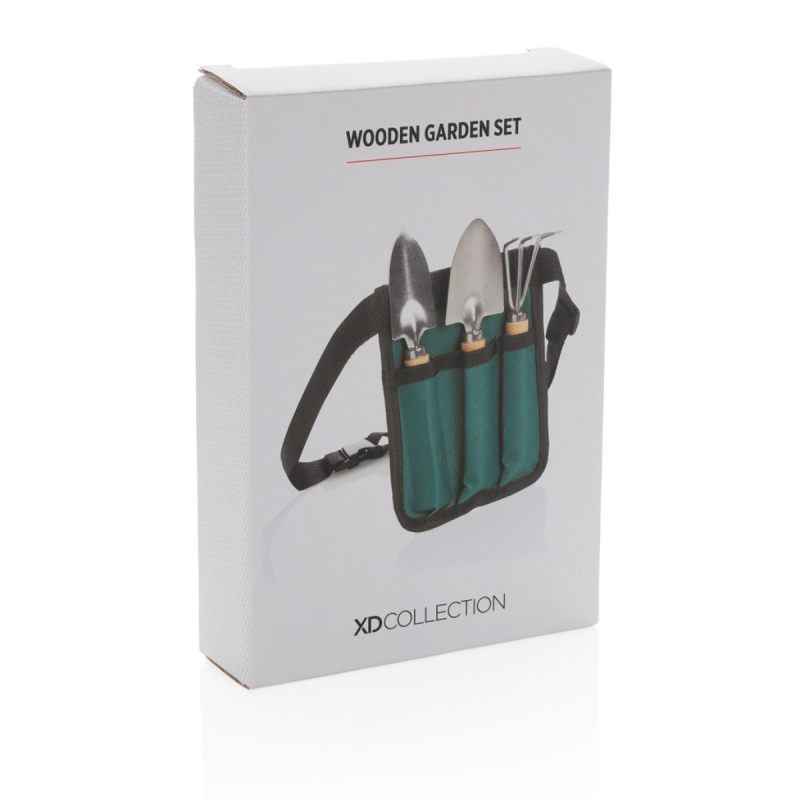 Zahradní sada ze dřeva obsahující velkou a malou lopatu a hrábě. Pouzdro z polyesteru kolem pasu pro uchování nářadí. Přizpůsobitelný opasek s klipem s délkou až 120cm.