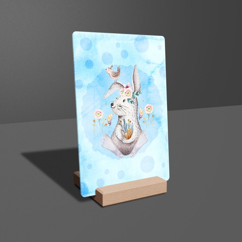 Na produktovém fotu vyobrazena nejoblíbenější varianta akrylového skla 14x21/21x14cm a dřevěný stojánek 10x10cm.