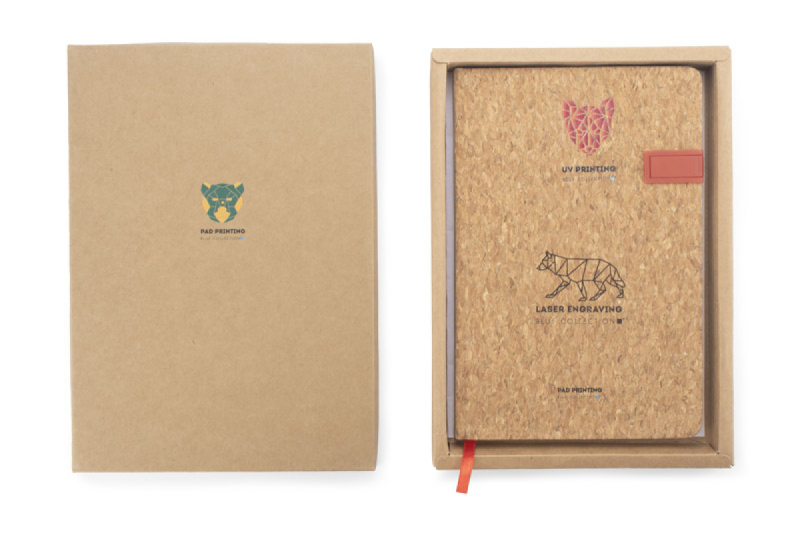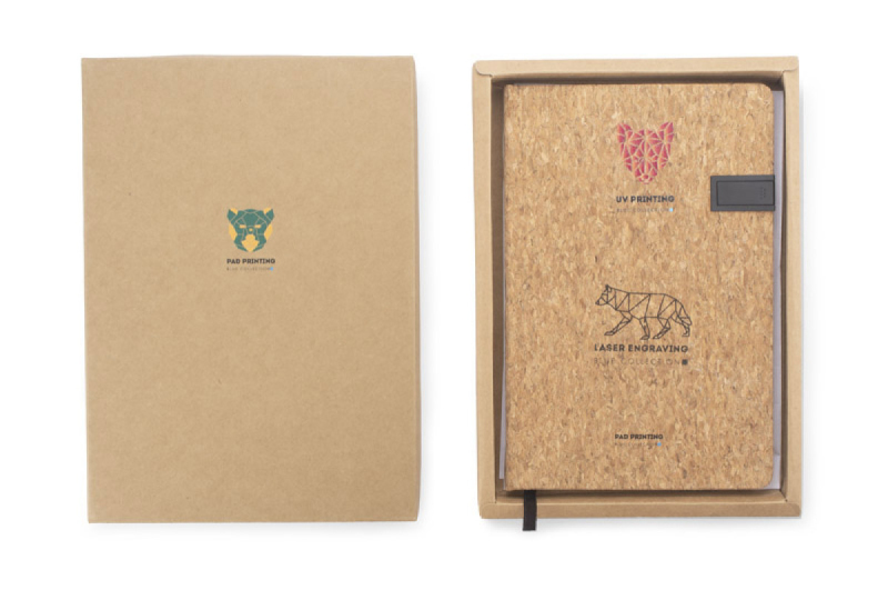 Zápisník v tvrdém korkovém obalu. Kryt má 16GB USB flash disk. Obsahuje 80 linkovaných listů. Stránky v poznámkovém bloku z papíru.