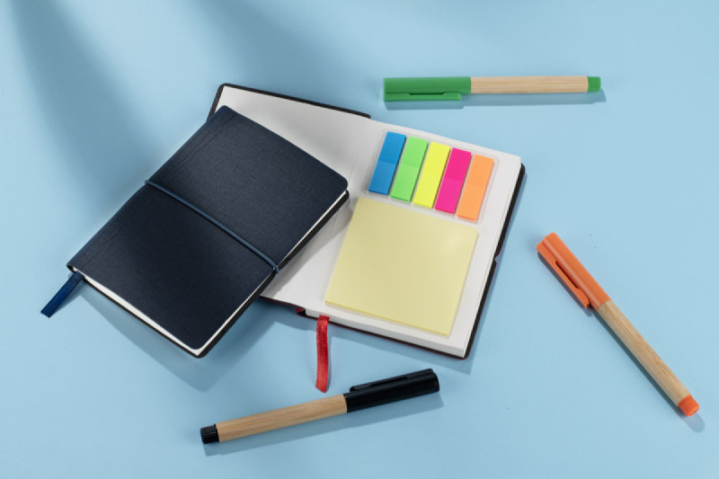 Zápisník POSTI ve formátu A6 je kompaktní a funkční zápisník, který je ideální do kanceláře, na schůzky nebo na cesty. Je vybaven linkovanými stránkami, žlutými samolepicími poznámkami a barevně odlišenými indexovými záložkami, které vám pomohou uspořádat vaše poznámky a úkoly. Uzavírání na gumičku zajišťuje obsah a díky lehkému provedení se snadno vejde do tašky nebo batohu. Praktický a připravený k označení - ideální jako reklamní pomůcka.