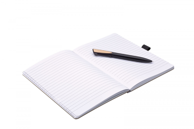 Poznámkový zápisník s linkovaným papírem v bambusových deskách v černé dárkové krabičce. Součástí je černá propiska Quara.