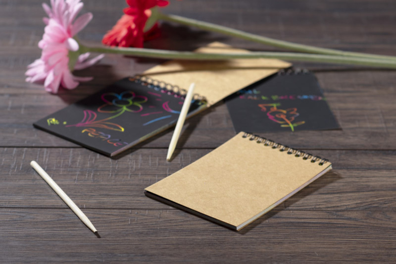 Neobvyklý zápisník s černými stíracími lištami. Bambusovou hůlkou můžete vytvořit barevný duhový obraz. To vám umožní rozvíjet svou vlastní představivost vytvořením vlastních kompozic.