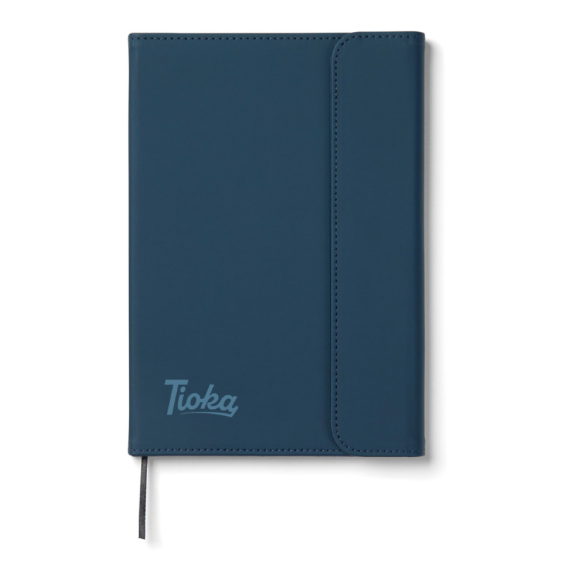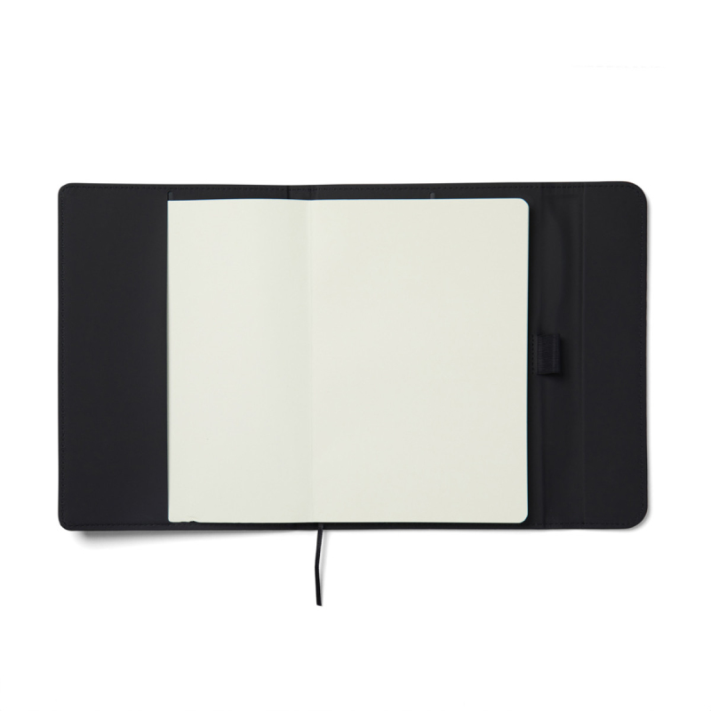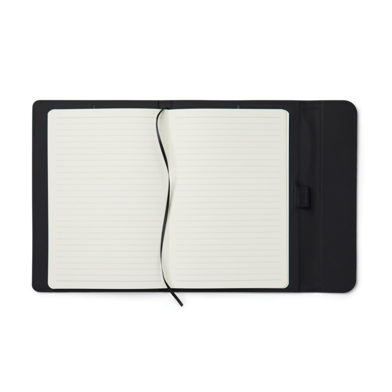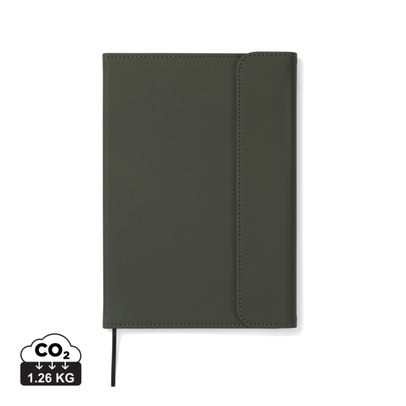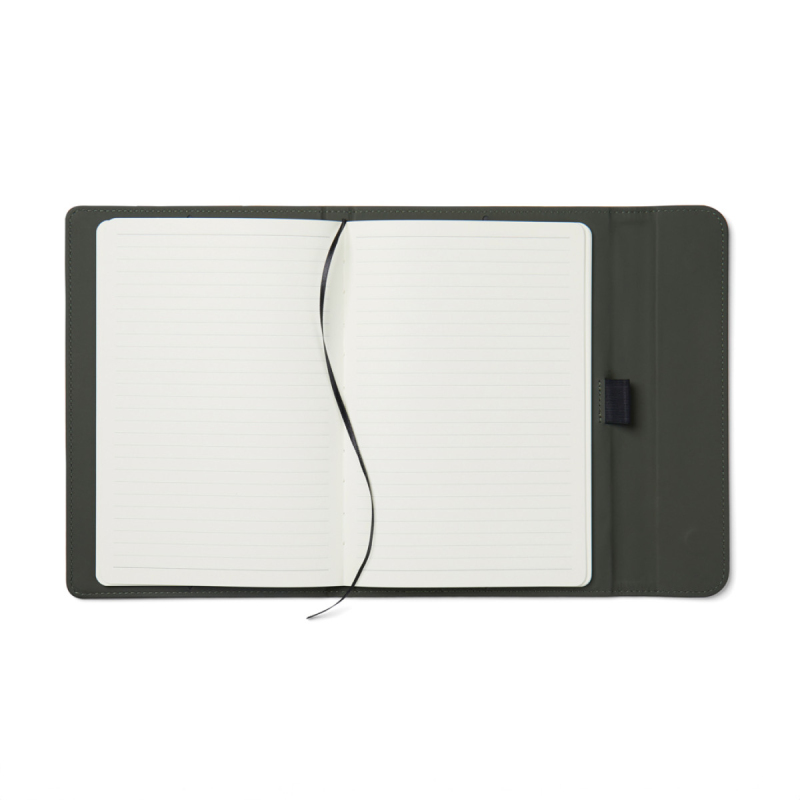 Stylový obal na zápisník z matného z recyklovaného PU. Magnetické zavírání, integrovaný držák na pero. Obsahuje vyměnitelný zápisník s 80 listy/160 stranami linkovaného recyklovaného papíru (70g/m2). Vyrobené z GRS recyklovaných materiálů. GRS (Global Recycle Standard) je globální standard, který umožňuje ověřit použití recyklovaného materiálu v produktu napříč celým dodavatelským řetězcem. Celkový podíl recyklátu dle váhy produktu: 54 % (zápisník) a 5 % (obal).