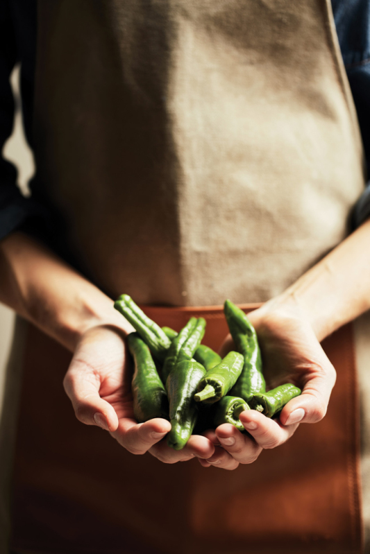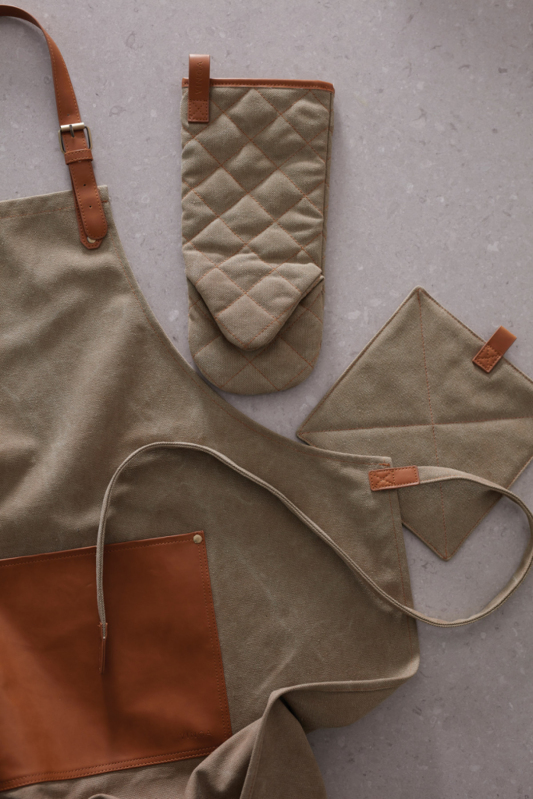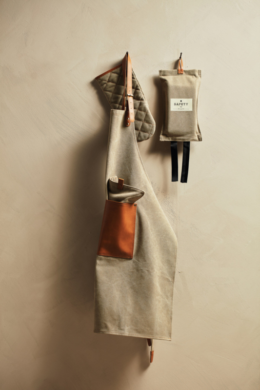 Robustní zástěra ze sepraného plátna 500 g/m2 s detaily z PU kůže. Zástěra, která stárne důstojně.