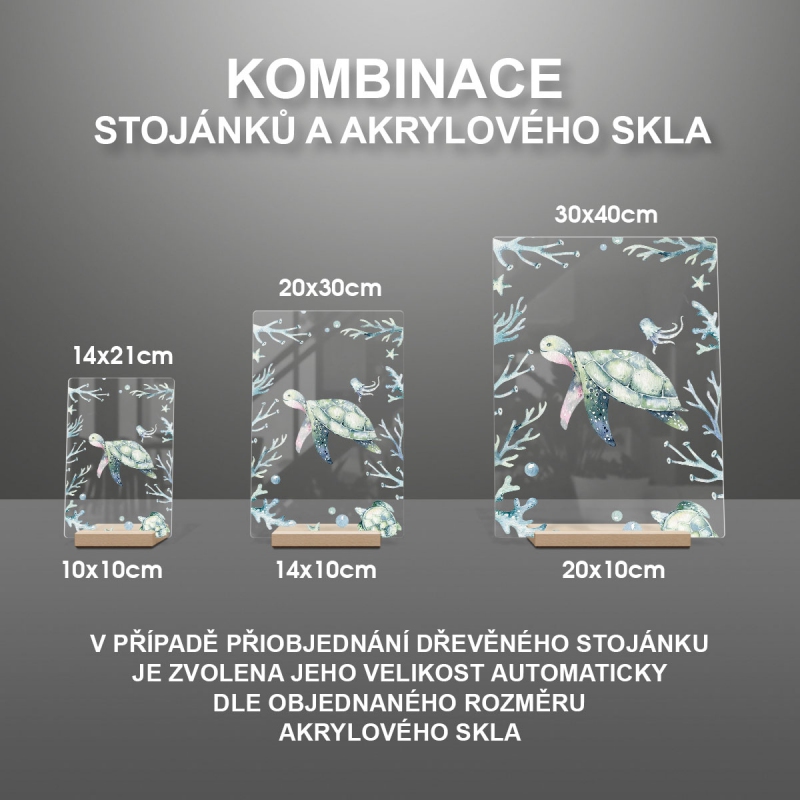Na produktovém fotu vyobrazena nejoblíbenější varianta akrylového skla 14x21/21x14cm a dřevěný stojánek 10x10cm.