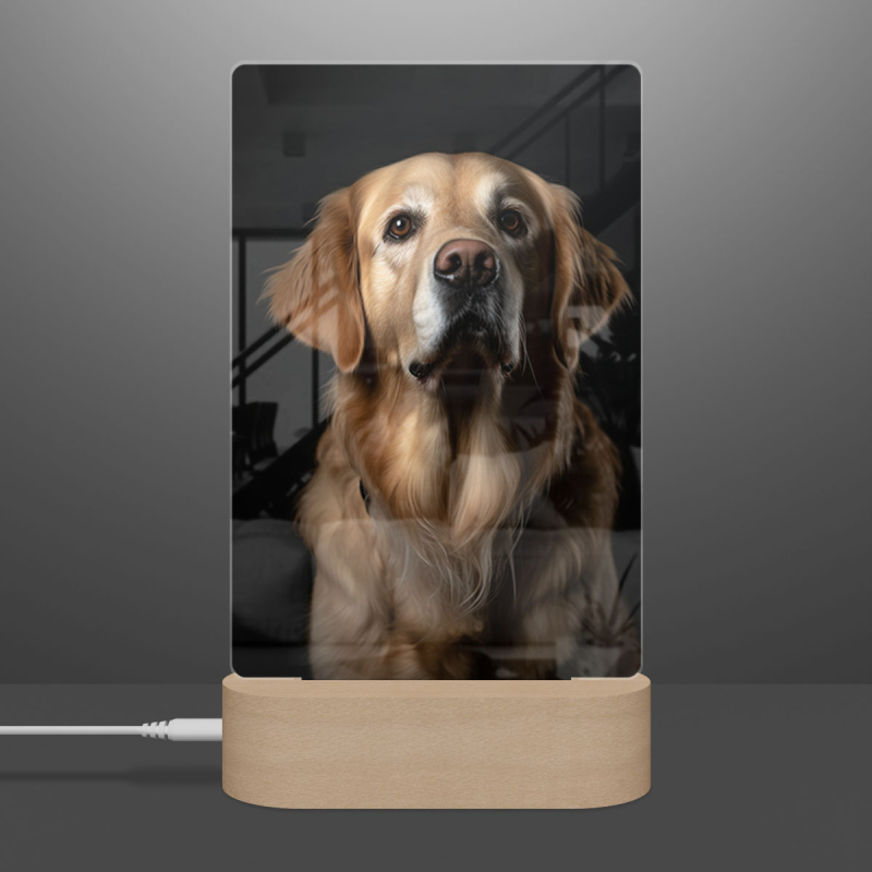 Součástí balení je akrylové sklo dle výběru, dřevěný RGB LED stojánek a napájecí USB kabel.